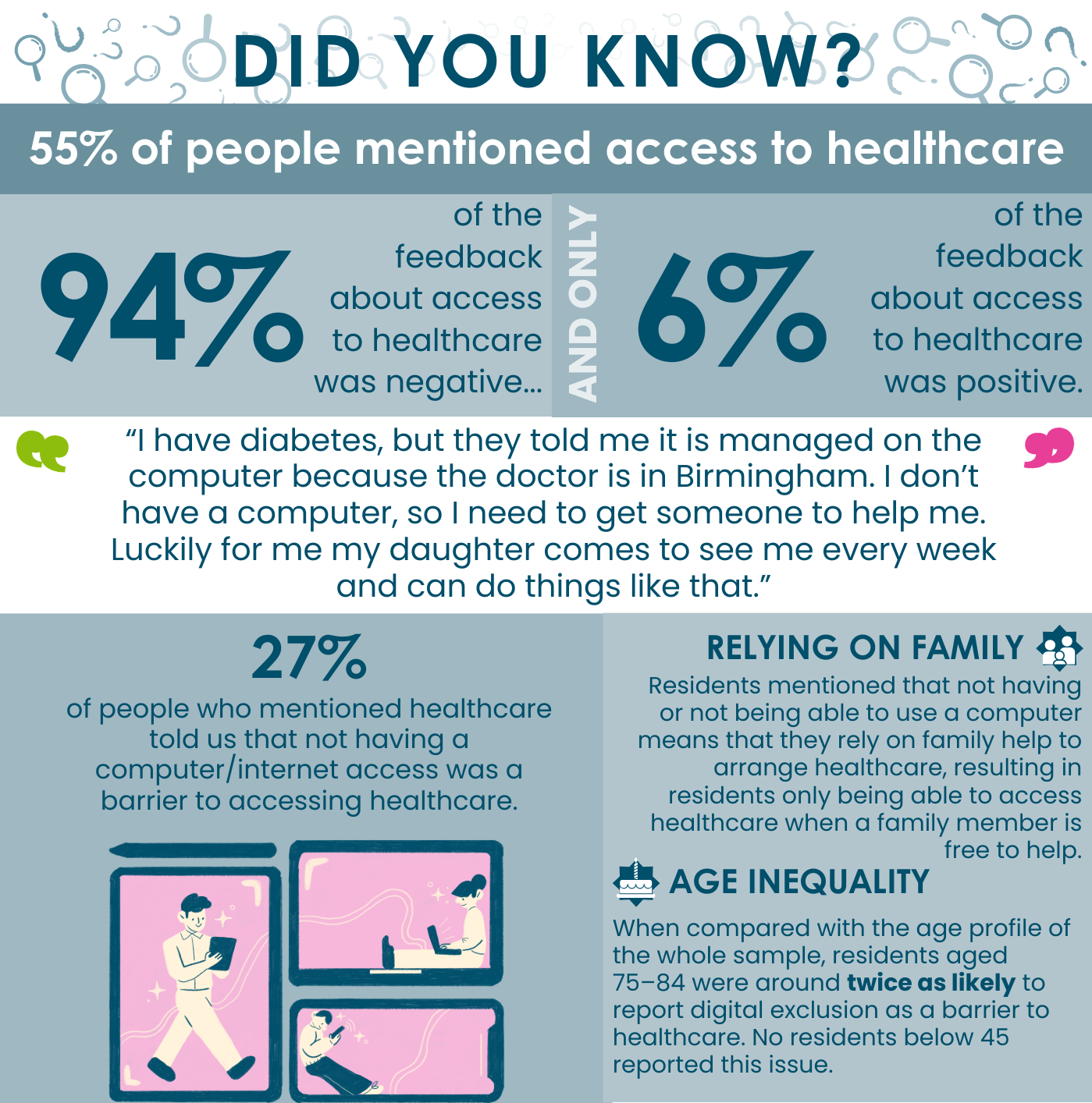 Digital exclusion is also a problem. 27% said lack of computer/internet access prevents them from accessing care. No one under the age of 45 raised this as an issue, and people aged 75-84 were twice as likely to report this as an issue.
