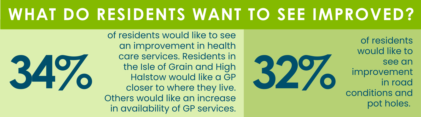 - 34% would like to see improvements to health care services, including more local GP access.